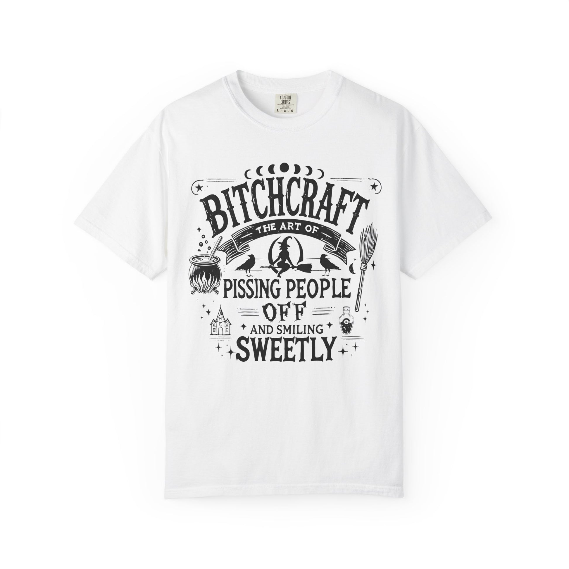 Embrace your mischievous side this spooky season with this bold tee featuring: “Bitchcraft — The Art of Pissing People Off and Smiling Sweetly.” Perfect for showing off your Halloween sass and dark humor, all while staying cozy and stylish.